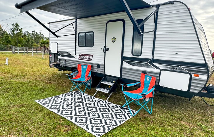 All of our units come equipped with camping chairs, outside rugs, cooking pans, utensils, plates and cups, toilet paper, paper towels, coffee maker, coffee, creamer, toiletries, bedding and much more!