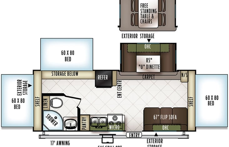 Fully equipped, spacious hybrid camper. Easy to tow! Get the best of both worlds, a little tent, and all the modern luxuries. Tons of space with a slide out dining area. Three queen size fold out beds with all linens included.