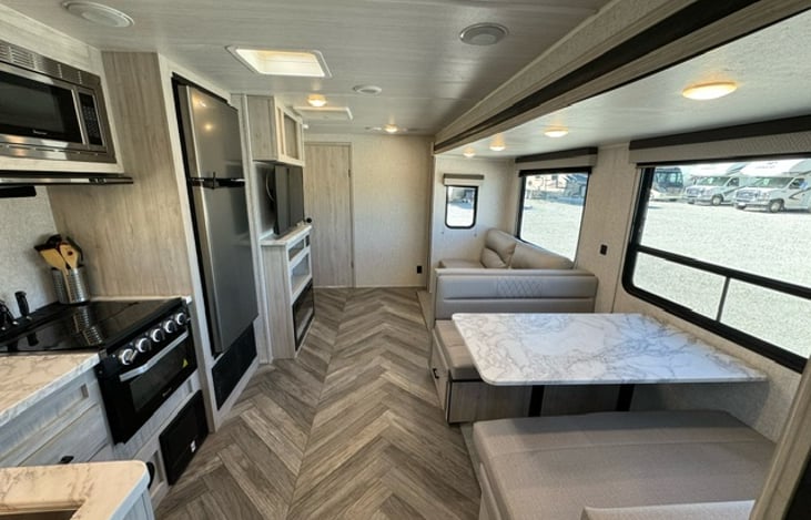 22 East to West Delta Terra 261RB. This spacious RV has a custom king mattress bed, large dinette that makes into a bed, jack knife sleeper sofa, electric fireplace, large closet/pantry, and a huge rear bathroom! With its large single slide there is plenty of room to move about. Stocked kitchen for all your cooking needs, small coffee pot (small filters needed) toaster, pots, and pans.