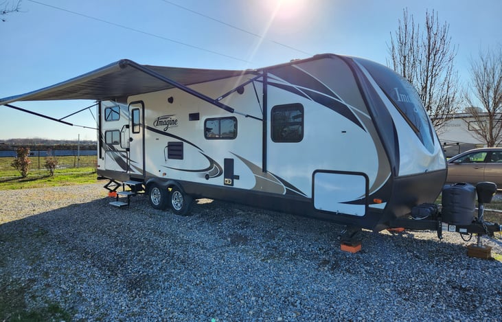 You have here a Grand Design Imagine, immaculate condition very clean. Very spacious and perfect for a family or couples. Bunk beds, couch that turns into a bed. Privet queen room with a privet TV. Stand up shower and a toilet and sink. Hot and cold water available. Living room that contains a dining table with a full kitchen with appliances along with a TV. and Roku.