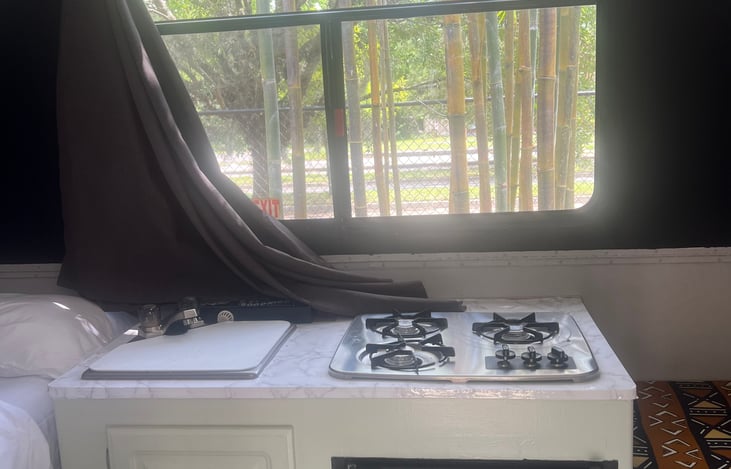 Old skool Hard side top pop up newly renovated. Perfect for a solo trip or couples getaway. This camper offers a queen bed with a separate dinette seating, air fryer, sink, mini fridge and freezer, coffee maker, gas range stove top , tea kettle and AC/heat. Lightweight and can be towed by many vehicles. Roof is manually lifted and is easily raised.