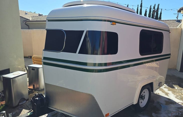This lightweight trailer is only 950 lbs and can be towed by any car. With the pop up top you can stand up inside the trailer and be able to cook in the kitchen area.