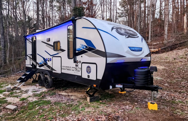 Brand new Alpha Wolf 22SW-L travel trailer with all the fixin's. It has a private bedroom as well as a trifold couch in the living area for 2 additional guests to get a comfortable night's sleep. It has great air conditioning and heat, as well as on demand hot water so you can have a normal shower when needed. There is also an outdoor kitchen with a small fridge and an ice maker.