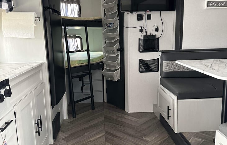 Go on an adventure with this family friendly, easy towable travel trailer. Can sleep up to 6, even though a family of 4 would be more ideal. Features queen Murphy bed, double bunks with a small foot print but very spacious!