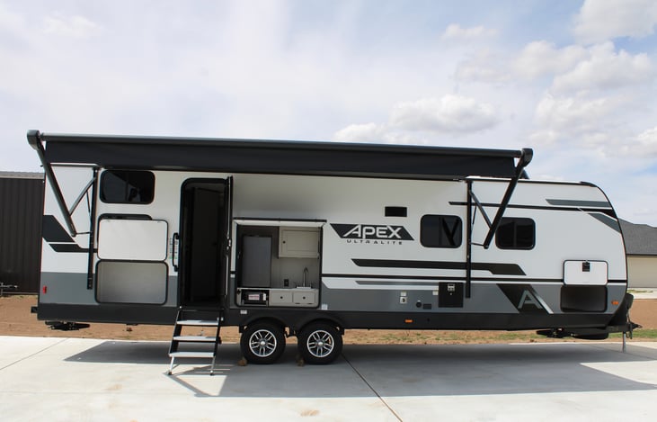 2024 Coachmen Apex UltraLite 284BHSS. Sleeps 8 comfortably and has a full shower & bathroom. Privacy master suite with large panorama window, full outdoor kitchen (our favorite feature), large slide out, extra large awning, LED outdoor lighting, tons of compartments and lots of windows for enjoying your destinations scenery! Blackout curtains included, as well as copious amounts of storage.