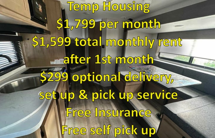 Temp Housing. $1,799 per month. $1,599 total monthly rent after the 1st month. $299 optional delivery, set up & pick up service. Free Insurance. Free self pick up.