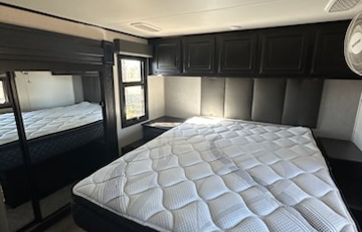 This camper has a king bedroom, with a double vanity restroom, (His & Hers) Our Camper has a, stove/oven , a Microwave , a residential fridge, a 4 top table, a separate living room area. In our living room both couches pull out into queen size b...