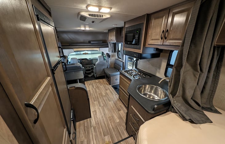 A traditional motorhome with the self-contained features you expect including a power generator. We love how much storage space has it has in the outside compartments- it's perfect for travelers with luggage.