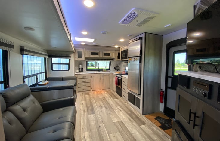 Spacious and comfortable with 2 slide outs, 2 entrances, a king size bed, a dinette that can be shifted into a cot for kids, a couch that shifts into 2 recliners that have massage and heat capabilities, a Bluetooth radio that can be played both inside and outside the camper; large kitchen area; fully stocked - includes linens, dishes and cookware; 6’5” man approved head clearance ✅