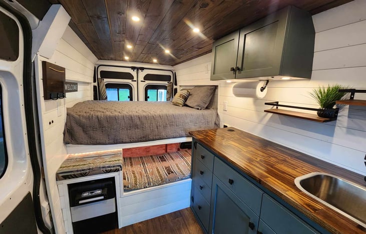 Dodge Ram Promaster camper van with 6'3" interior height, with AC that can plug-in to a site while camping *, solar power, 400ah battery bank, maxxair fan, cassette toilet, 12v fridge, and queen-size bed. This is a front-wheel drive vehicle.