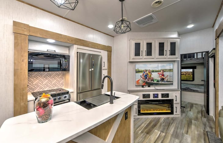 Enjoy the great outdoors in style with all the luxuries of home. This 43 foot camper with 3 slides provides space for up to 6-7 people so don’t hesitate to bring the family and friends. The private master features a king bed, smart TV, dual closets, storage both above and under the bed.