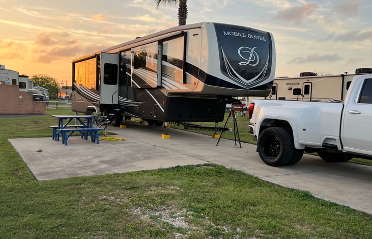This Rv is at Palmdale RV resort Los fresnos Texas. This is about 25 minutes from south padre island in a super quiet relaxed resort that offers all types of amenities.