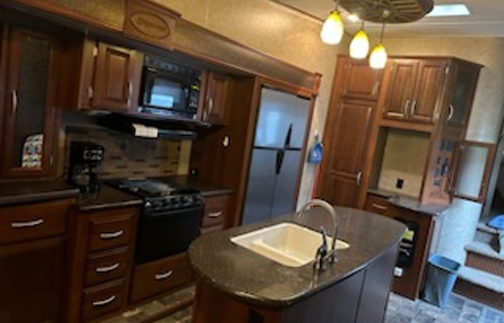 Beautiful fifth wheel camper fully equipped with linens, dishes, cookware, coffee pot, coffee and lots of goodies! This unit has a beautiful floor plan with tall ceilings and a kitchen with a full size refrigerator and beautiful center island. Cozy queen bedroom, sofa with hideabed and comfortable loveseat with double recliners. Sleeps 5-6. We offer delivery and set-up for a very reasonable price.