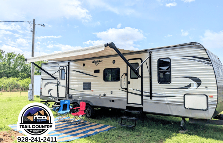 Your home away from home! Inside this spacious 35' camper you will find two slide outs, two bedrooms, a stocked kitchen with comfortable seating, an outdoor kitchen plus a TV, DVD player, radio, Bluetooth, and USB charging ports!