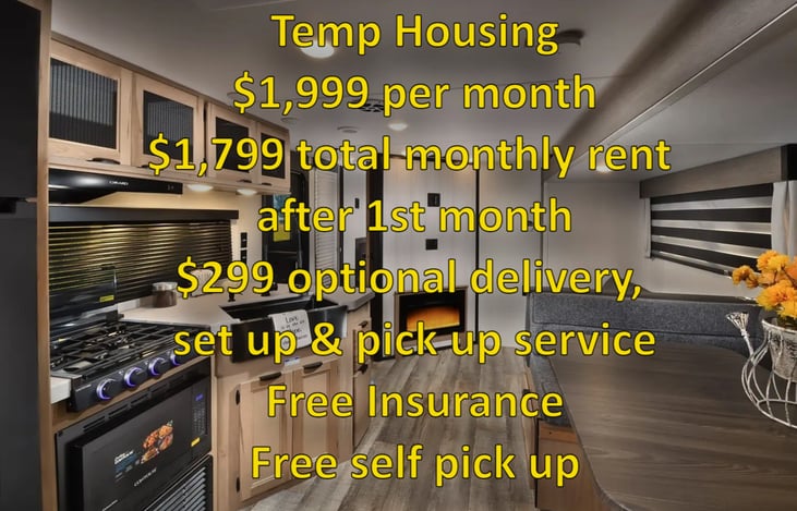 Temp Housing. $1,999 per month. $1,799 total monthly rent after the 1st month. $299 optional delivery, set up & pick up service. Free Insurance. Free self pick up.