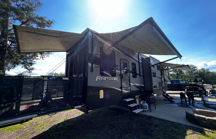 The exterior of the 2020 Keystone Raptor 354 emanates rugged charm and durability. It's designed to endure the challenges of the road, offering peace of mind for your journeys.