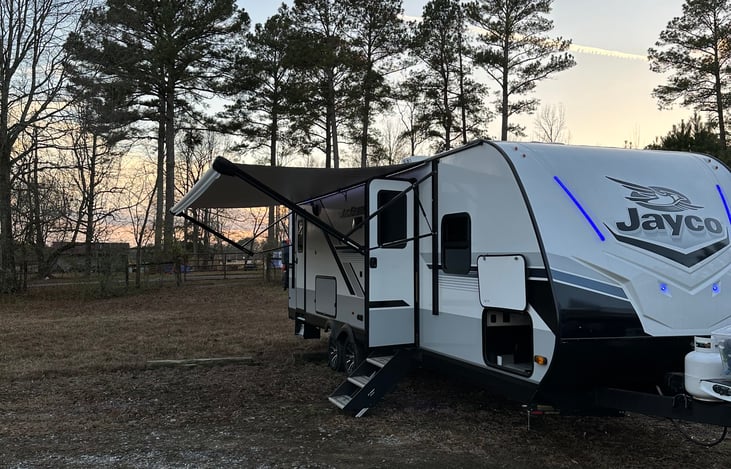 Brand new modern rv , easy setup , plenty of space , everything needed to setup the rv is included, 1 indoor smart tv in the living room and also 1 smart tv included to mount outside under the awning. Outdoor kitchen with grill , mini fridge and spray port for water, convenient access to bathroom through rear of camper.