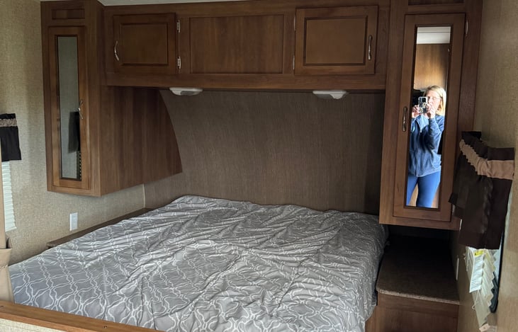 Hi! This is a very cute Rv don’t let the 2015 fool you it is very well taken care of and has lots of amenities. It has a queen bed and a bunk with a full size on the bottom and a single on the top. It has a full bathroom and stove refrigerator and microwave.