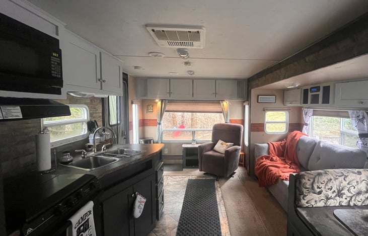Just like home! This cozy camper has everything you need and all the comforts of home. Kitchen area includes 3 burner stove/oven, microwave, fridge/freezer, plenty of storage. The camper sleeps 5 adults (or 4 adults and 2 kids).
