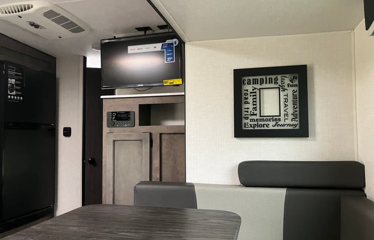 Everything you need to go camping. 26 ft bunkhouse sleeps 6 people. Dishes, silverware, pots and pans, coffee machine, k cup machine, Seasoning , 22 inch Black stone Griddle, folding table for the Black stone outside.camping chairs, tv, Bluetooth radio, ac, heat, slide out dinette, two bunk beds and a queen size bed, nice size bathroom, toilet paper, towels and sheets,