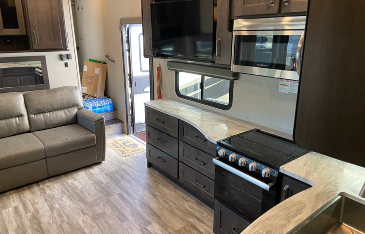Step inside this luxurious fifth wheel and you'll be greeted by modern amenities and stylish decor.