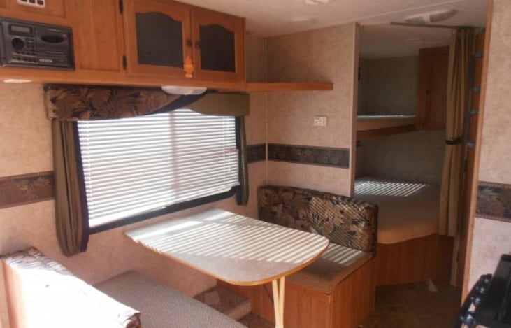 1. My camper comfortably sleeps 6. Has a cozy, queen-sized bed with memory foam mattress, couch that converts into a bed, a dinette that converts into a bed and a twin over full bunk bed.