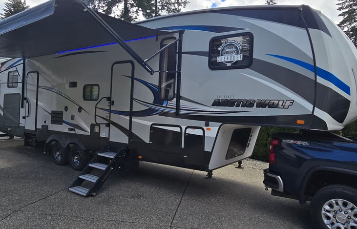 Welcome to our luxurious fifth wheel getaway. Our 2018 Arctic Wolf offers a spacious floor plan with two bedrooms and two bathrooms. The large bunkhouse, complete with its own TV and blu-ray player provides a fun and comfortable space for children. The secluded master bedroom ensures a quiet retreat for parents. The fully equipped kitchen and outdoor kitchen cater to all your culinary needs.