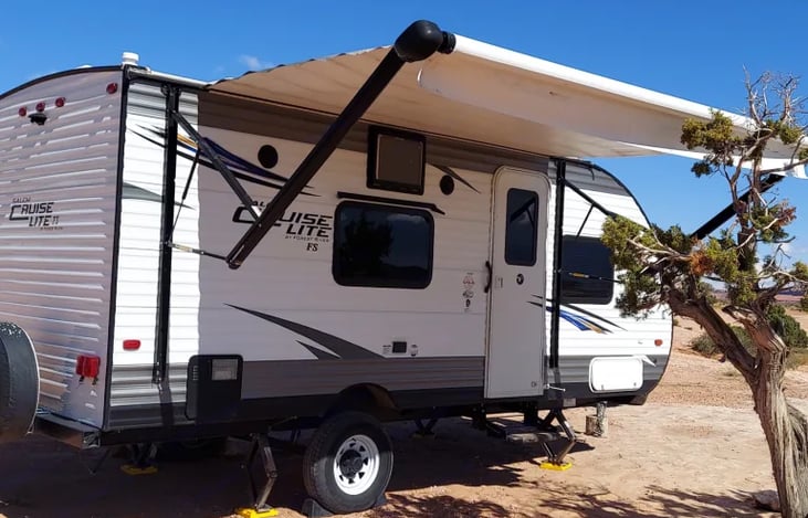Planning a getaway? Look no further! Our camper is perfect for your trip! Equipped with a mini fridge, gas range, sink, ample counter space, and a 12-foot electric awning, this camper has everything you need. With outdoor speakers and 12-foot porch lights, you can enjoy the outdoors in style. It's towable by midsize SUVs and the queen-size bed has an 8" memory foam mattress for your comfort.