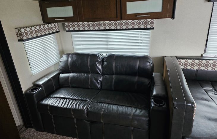 Spacious 33 ft camper with upgraded queen mattress. Sleeps 10. Outdoor kitchen has a small sink with hot and cold water, a small refrigerator, and 2 propane burners. Bring your blackstone/grill for maximum outdoor cooking experience with a quick connect attachment located under the outdoor kitchen.