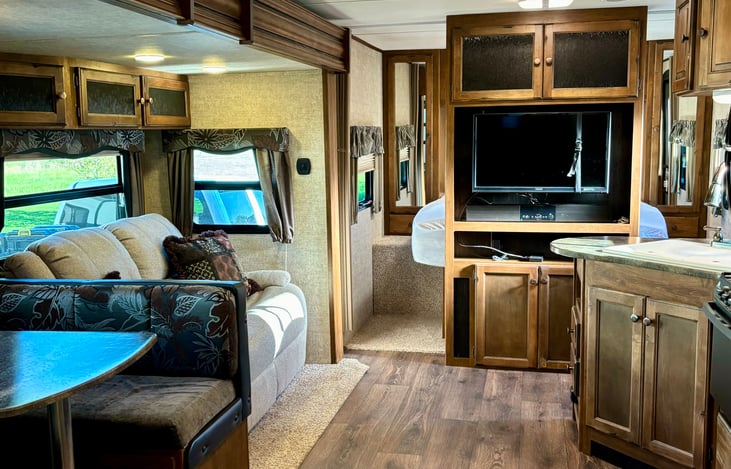 This camper is perfect for an entire family! With the front queen bed, a reclining couch, dining table that converts to a bed, and a separate rear bunk room, there is more than enough room to forget you're in a camper. The rear bunk room has a folding sofa, and two bunk beds. There is a TV on a swivel mount to face the comfy recliners, radio, and our favorite...an outdoor kitchen!