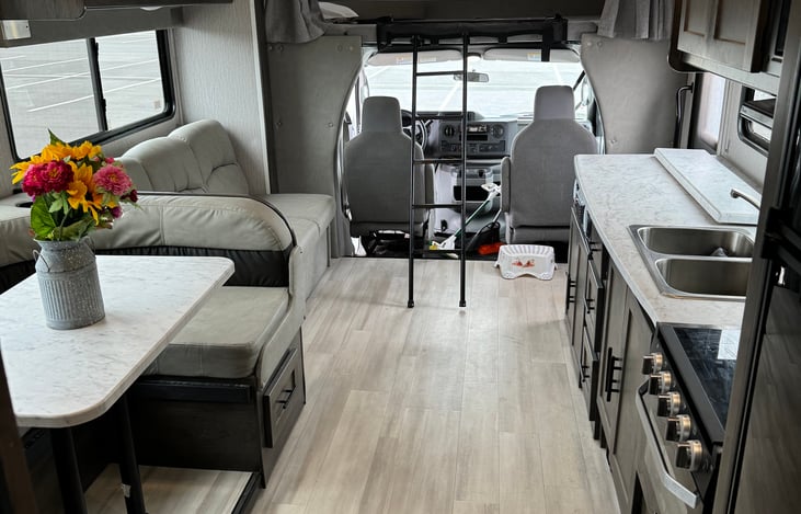 Very clean 2022 Coachman Leprechaun. 32 total feet. RV is easy to drive. "RV Rental Delivery and Set-Up is available," Rv has rear master bed with queen bed. Dinette folds into double bed, jack knife couch folds into double bed, over the cab is oversize queen bed. Bike rack included, which can hold 2 80lbs e-bikes. Rv is ready to hit the road and make some memories.
