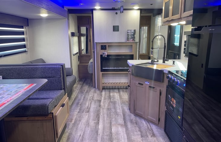 Family-friendly fun! Our new RV is very modern and spacious. It sleeps nine comfortably and is great for a family getaway. A lovely outside kitchen is equipped with a stovetop, ice machine, and mini fridge.