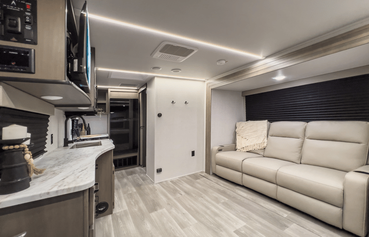 Carlos & Kim's camper has a great layout and storage. The couch has 2 recliners, and you can walk up both sides of the bed. They delivered and set up the camper. Overall great experience renting from Carlos.