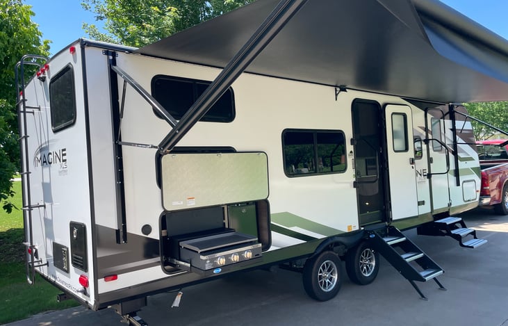 Enjoy our family friendly luxury travel trailer with double bunk beds, heat and massage recliners, oversized refrigerator and pantry, outdoor kitchen, and large 22' awning. This roomy but light weight RV comes with a weight distribution and sway control hitch system for easy towing. Actual tow weight with existing cargo is about 6,500 lbs.