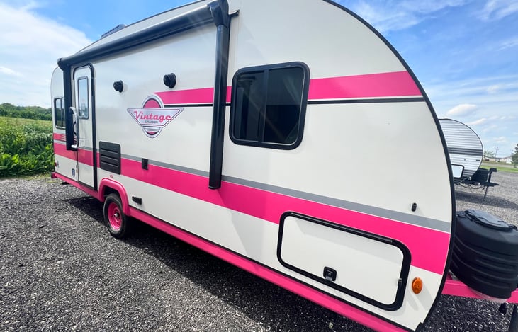 Brand New 2024 Pink Gulfstream Vintage Camper. She sleeps 3-4 people with a dinette in front that goes to a double bed, and either 2 Twin beds or King bed on the back!
