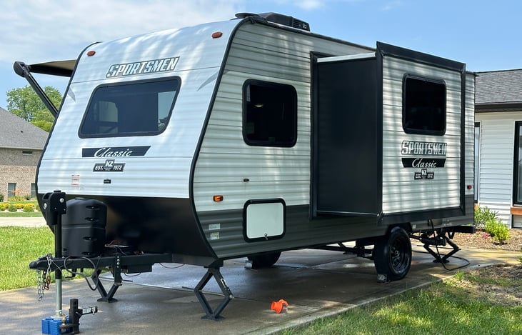 This is a KZ Sportsmen Classic 181BH. We love camping in this camper. We have pulled it to Kentucky and stayed for the weekend and it travels so easy. It is very cozy and clean inside and out. No leaks and everything works great. It sleeps 5 people. It has a full size bed with an upgraded 8in Memory Foam mattress 54”x80”. The dinette table is 30” wide and folds down to a bed.