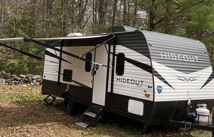 Abundant storage throughout makes this Hideout Single Axle unit easy to keep organized! You will love the exterior pass-through compartment up front for all of your outdoor camping gear and yard games. With a 10' power awning, you can enjoy the evening playing corn hole and roasting marshmallows over a campfire.