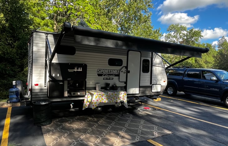 We provide a clean bunkhouse camper with outdoor kitchen Sleep up to 5 with a queen size mattress with topper for extra comfort, rear bunks also include mattress toppers and dinette turns into a bed. Fridge is very big for an rv and outdoor shower is great for rinsing off.