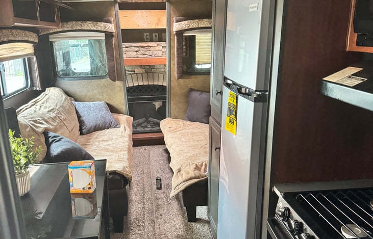 This RV is great for any family who wants to get away. The living room is equipped with 2 futtons which are greatly used as full bed. The bathroom has immense amount of space and it has sliding shower doors do no mess are made. The bathroom has 2 entrances one through the main door and one from the bedroom.