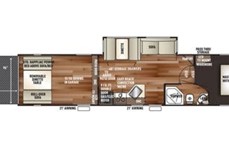 Bring your toys with you in the 12’ garage, spacious loading ramp that converts into an off ground patio. Garage space doubles as an additional sleeping space or family game space.
