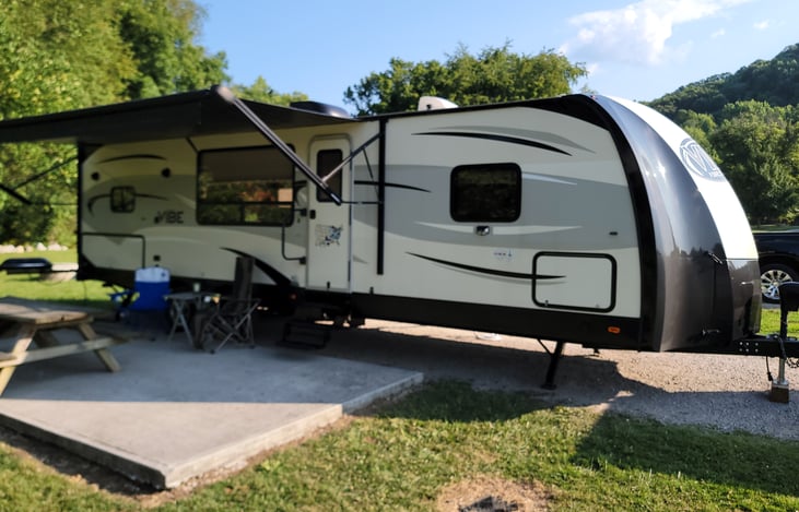 We have a 2016 Forest River vibe. 32ft located in Hebron, KY. It has one slideout for the dining room and living room. Sleeps 6, one queen bed with waterproof cover, dinette and couch fold out, two recliners, full bath