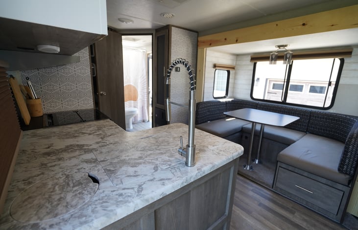 Welcome to the Vibe Adventure's listing! The trailer has a modern farmhouse look and the wife did a great job decorating and making it feel homey.