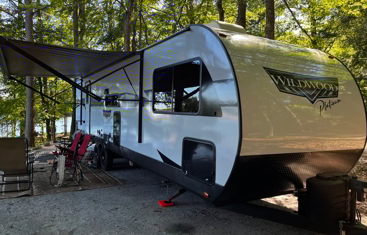 This new 2024 Forest River Wildwood platinum RV sleeps up to 8 people making it ideal for larger families or groups. It has a king master with walk in closet. Relax knowing you have 1 and 1/2 baths. It has a rear private bunk room with a set of double bunkbeds with storage underneath, a desk, the private half bath is located in the back beside bucks.