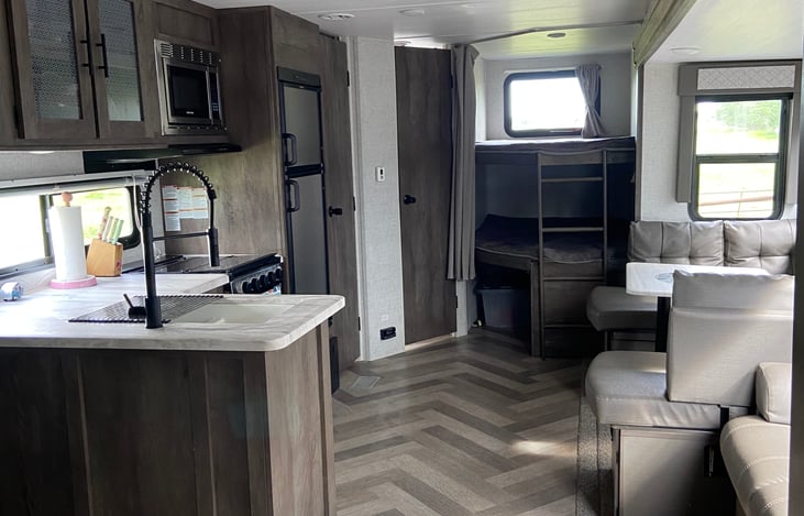 Large and roomy travel trailer is family friendly with a bunk beds for the kids in the back. Parents get their own space on the other side of the camper with an RV queen short size bed. The spacious living area includes a Tv and dvd player with a few dvds as well. The electric slide out is as simple as pressing a button, and air conditioning cool enough to give you a break from the summer sun.