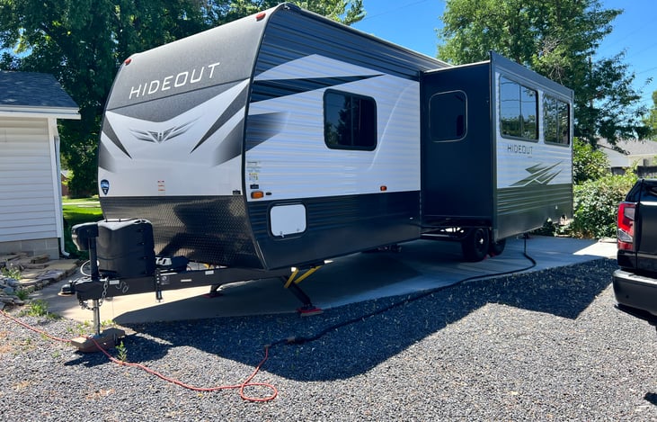 Fully stocked Keystone Hideout, includes Linens, dishes and cookware, toilet paper and cleaning supplies. Has a Central Vacuum. Can sleep up to 8 people. Hidden Pantry behind the TV. 40 inch TV in the main room. Outside fridge, cooktop, & shower to hose off dirt or sand before going in. Upgraded step ladder to get into the main door. Also a door off the master bedroom.