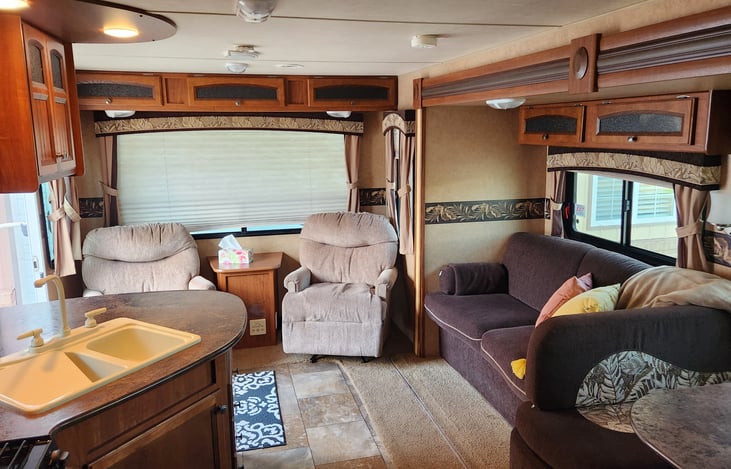 A well kept travel trailer with a queen bed, fold out couch, dining table (that can be a bed), two lounge chairs, kitchen, and full bath.