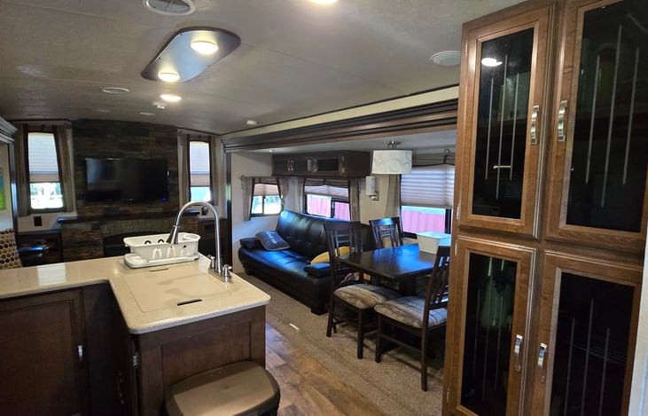 2018 Heritage Glen camper. 3 slide outs making it an open space. Couch pulls out and makes a bed as well as a futon that folds out which can sleep up to 4 in this room. Fireplace and flat screen TV. Master bedroom with California king mattress and flat screen Roku TV. Kitchen table with 4 chairs. Everything you need to cook with included. Bedding, towels, pillows included.