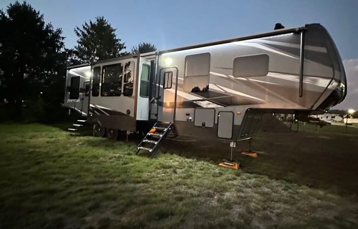 3 heated & cooled recliners with massage mode, 12’ garage with 2 queen beds and a bathroom, it also has a sun deck, if you want to camp in luxury, this is the camper for you.