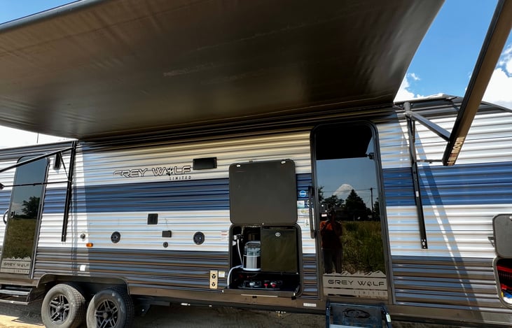 The outside features a 15' awning, black tank flush, input for cable (we provide the coax cable), outdoor speakers, 110 outlet, mini fridge, 2 burner stove with direct connection to the propane, ice maker, & water source.
