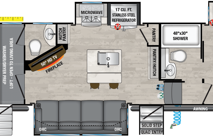 Our family camper is great for families and/or friends to travel together. With a main suite, bunk beds and a loft room, there is room to move about. Our favorite features are the back patio off the bunk room, extra restroom in the back, as well as the fireplace. Comfy and cozy, this camper has been across America!